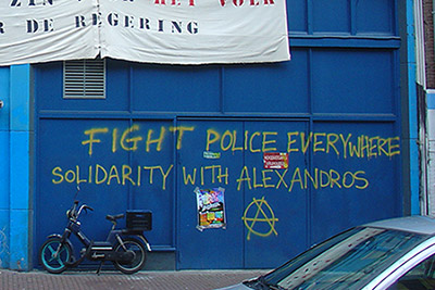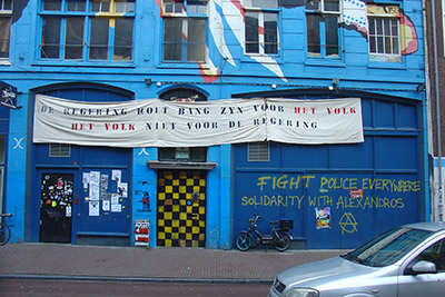 The building itself is well-known in Amsterdam for its colourful facade and anarchist slogans beside the door.